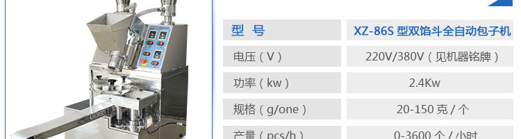 XZ-86S型雙餡斗全自動(dòng)包子機(jī),可生產(chǎn)各種肉包、肉菜包、菜包、小籠包、湯包、水晶包、圓饅頭、奶黃包、豆沙包、叉燒包、南瓜餅等幾十種包餡制品。適用于賓館、飯店、學(xué)校、機(jī)關(guān)企業(yè)食堂、饅頭或包子加工廠、早餐工程店及速凍食品廠等單位??蓾M足不同客戶群體。免費(fèi)提供工藝技術(shù)。免費(fèi)上門培訓(xùn)指導(dǎo)安裝。