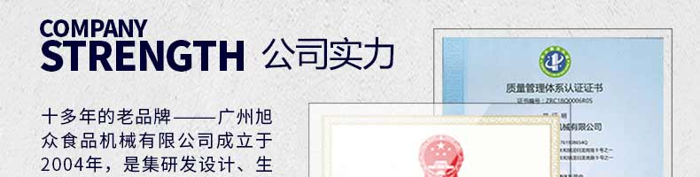 廣州旭眾食品機(jī)械有限公司是一家集科研開(kāi)發(fā),生產(chǎn)設(shè)計(jì),營(yíng)銷(xiāo)服務(wù)為一體的現(xiàn)代化生產(chǎn)企業(yè)。現(xiàn)代化生產(chǎn)車(chē)間,精湛制造技術(shù),所產(chǎn)機(jī)械歷經(jīng)市場(chǎng)重重考驗(yàn),不斷贏得海內(nèi)外客戶的贊譽(yù)。