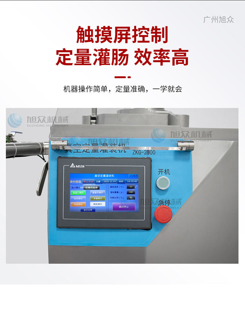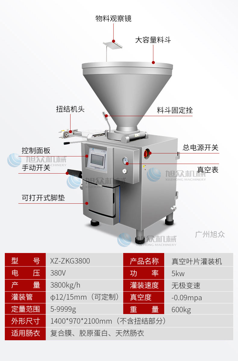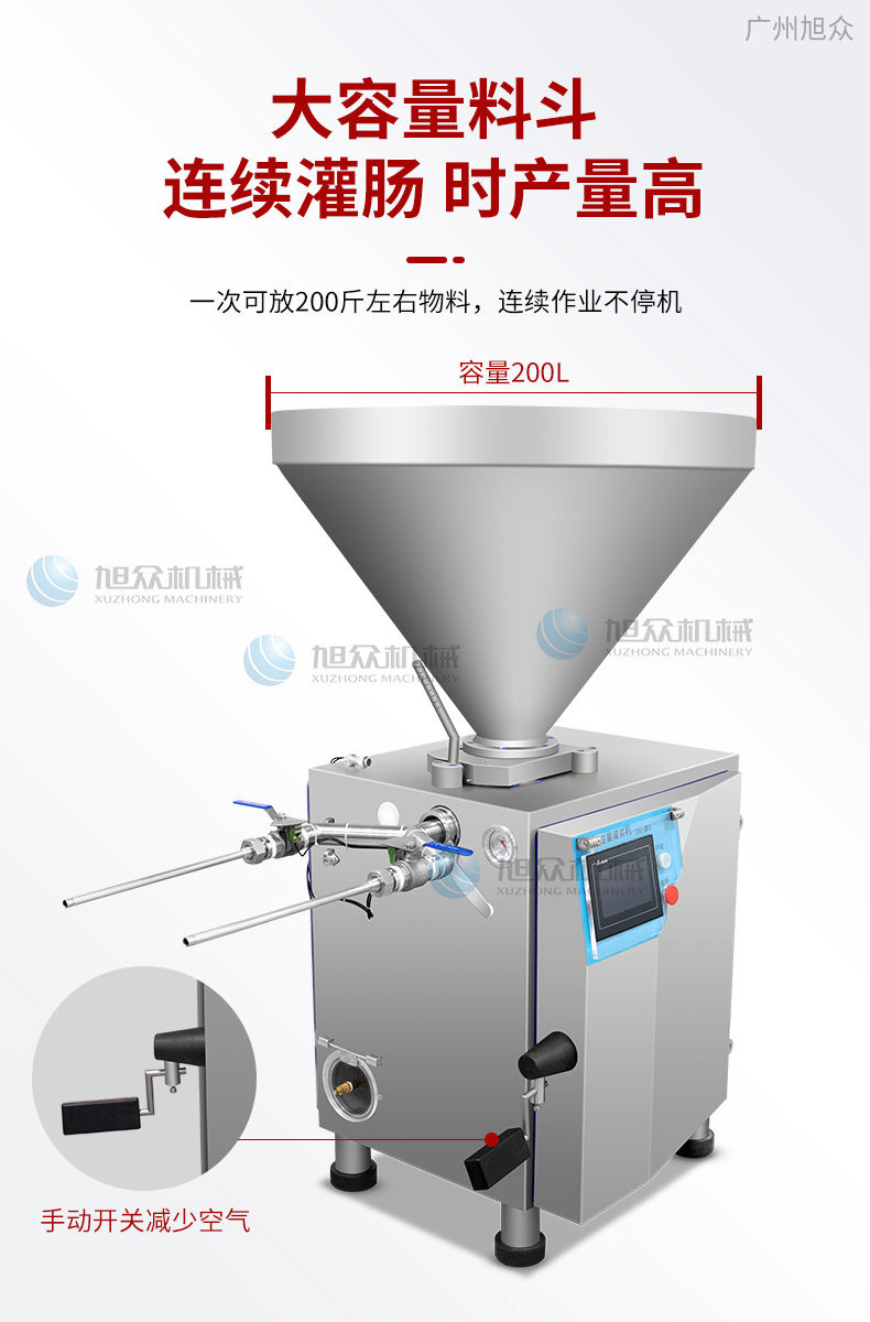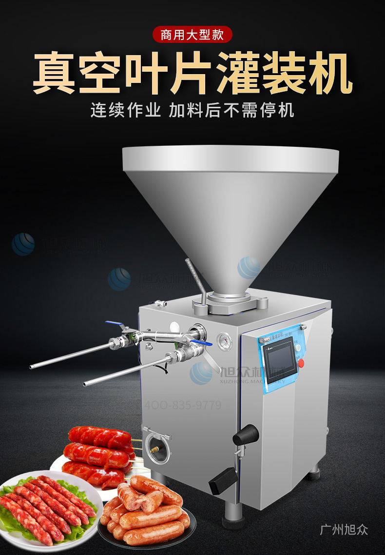 XZ-ZKG2800真空灌腸機(jī),真空葉片灌裝機(jī)連續(xù)作業(yè)加料后不需停機(jī),可灌肉粒&肉糜實用性強灌各種腸可做烤腸、親親腸、廣式臘腸、火鍋腸等連續(xù)灌制長腸。