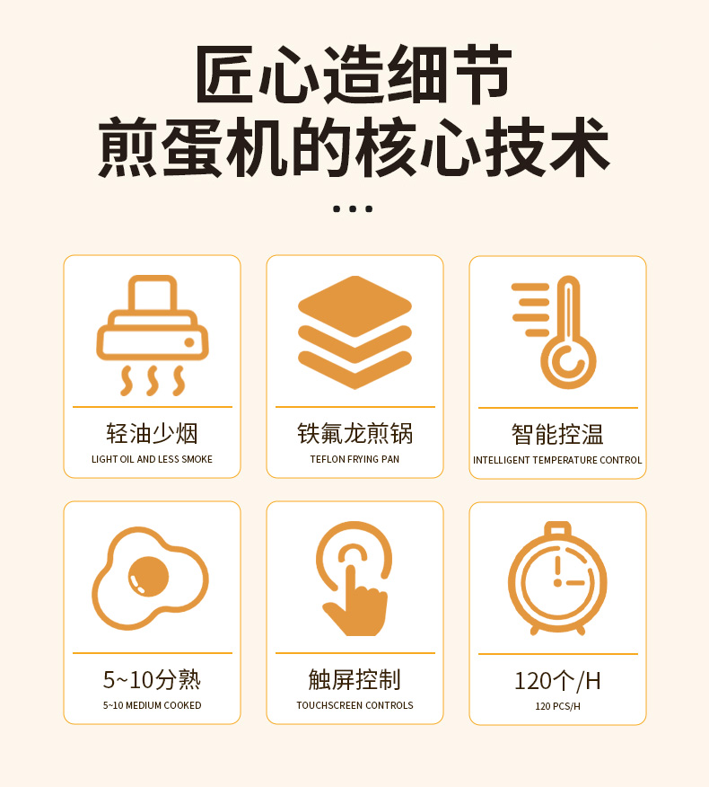 商用全自動智能煎蛋機,匠心造細節(jié)煎蛋機的核心技術(shù),輕油少煙、5~10分熟、鐵氟龍煎鍋、觸屏控制、智能控溫??谖秱€性化五分/七分/十分熟,智能控溫上下鍋恒溫煎烤。