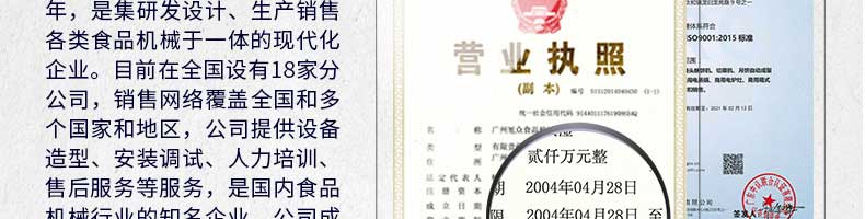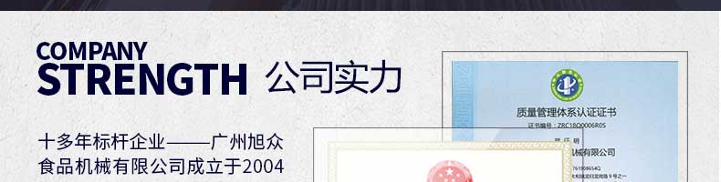 廣州旭眾食品機械有限公司是一家集科研開發(fā),生產(chǎn)設(shè)計,營銷服務(wù)為一體的現(xiàn)代化生產(chǎn)企業(yè)?,F(xiàn)代化生產(chǎn)車間,精湛制造技術(shù),所產(chǎn)機械歷經(jīng)市場重重考驗,不斷贏得海內(nèi)外客戶的贊譽。