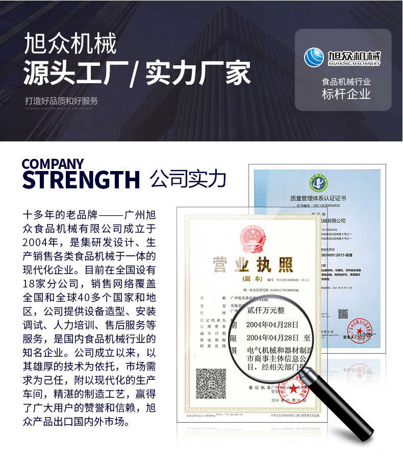 廣州旭眾食品機(jī)械有限公司是一家集科研開(kāi)發(fā),生產(chǎn)設(shè)計(jì),營(yíng)銷(xiāo)服務(wù)為一體的現(xiàn)代化生產(chǎn)企業(yè)。現(xiàn)代化生產(chǎn)車(chē)間,精湛制造技術(shù),所產(chǎn)機(jī)械歷經(jīng)市場(chǎng)重重考驗(yàn),不斷贏得海內(nèi)外客戶的贊譽(yù)。