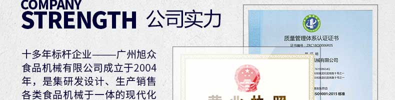 廣州旭眾食品機(jī)械有限公司是一家集科研開發(fā),生產(chǎn)設(shè)計(jì),營銷服務(wù)為一體的現(xiàn)代化生產(chǎn)企業(yè)。現(xiàn)代化生產(chǎn)車間,精湛制造技術(shù),所產(chǎn)機(jī)械歷經(jīng)市場重重考驗(yàn),不斷贏得海內(nèi)外客戶的贊譽(yù)。
