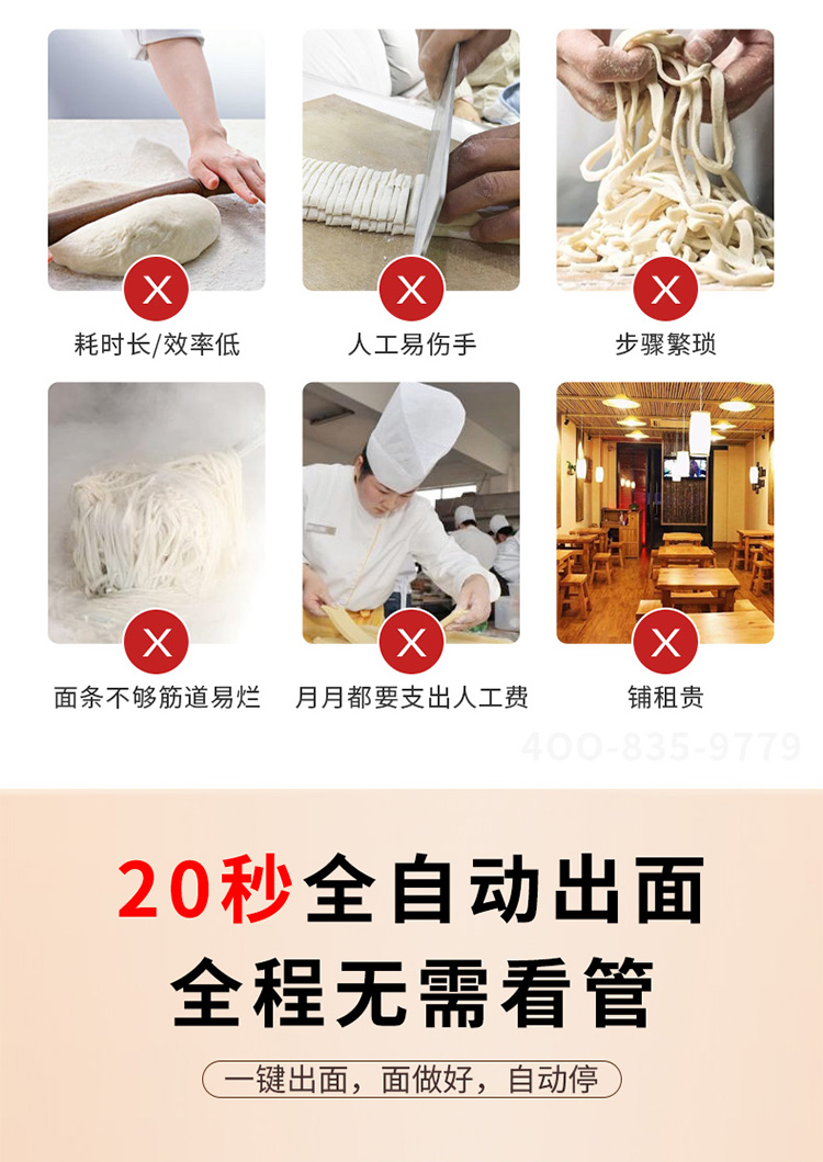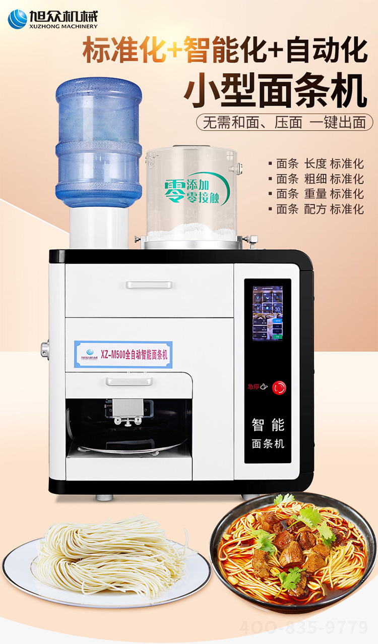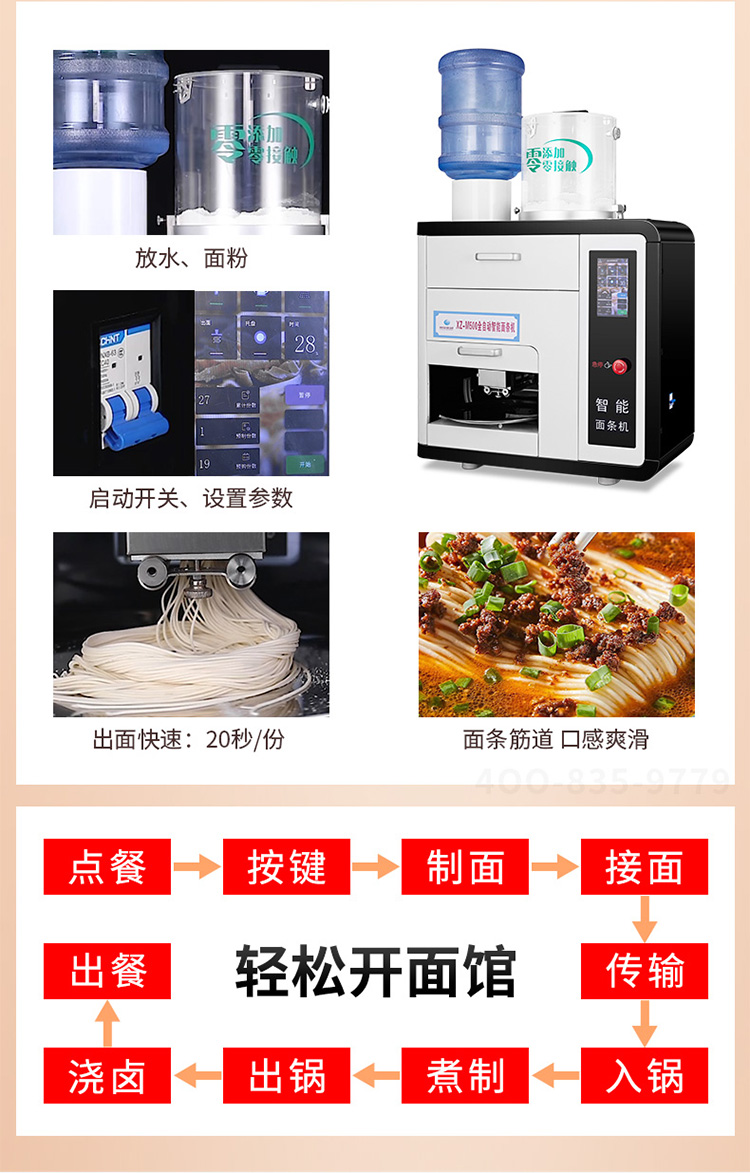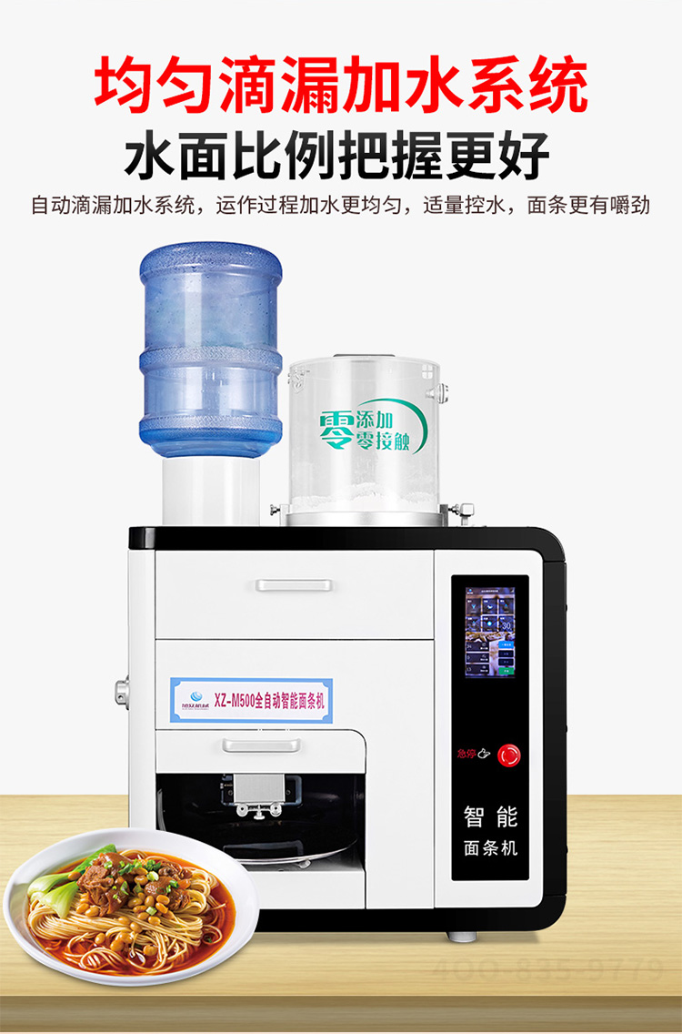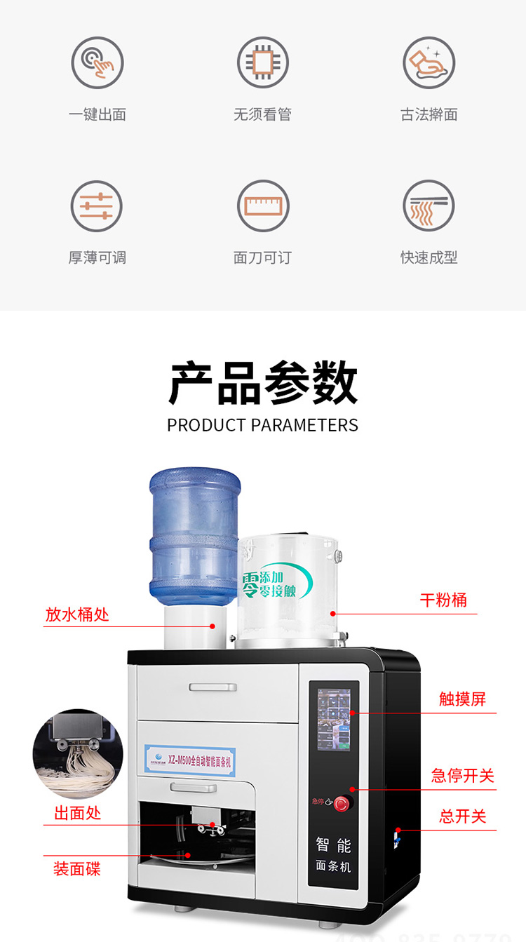 全自動(dòng)商用快速出面電動(dòng)素面濕面M500臺(tái)式制面機(jī)器,20秒全自動(dòng)出面,全程無(wú)需看管。一鍵出面,面做好,自動(dòng)停。均勻滴漏加水系統(tǒng),水面比例把握更好。自動(dòng)滴漏加水系統(tǒng),運(yùn)作過(guò)程加水更均勻,適量控水,面條更有嚼勁。