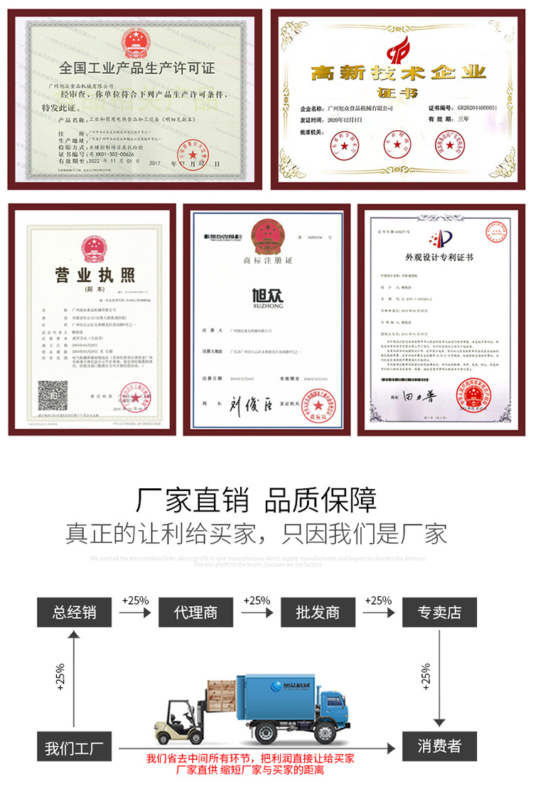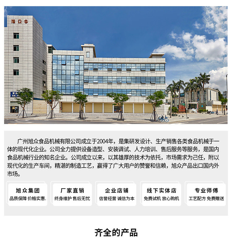 廣州旭眾食品機(jī)械有限公司是一家集科研開(kāi)發(fā),生產(chǎn)設(shè)計(jì),營(yíng)銷(xiāo)服務(wù)為一體的現(xiàn)代化生產(chǎn)企業(yè)。現(xiàn)代化生產(chǎn)車(chē)間,精湛制造技術(shù),所產(chǎn)機(jī)械歷經(jīng)市場(chǎng)重重考驗(yàn),不斷贏得海內(nèi)外客戶的贊譽(yù)。