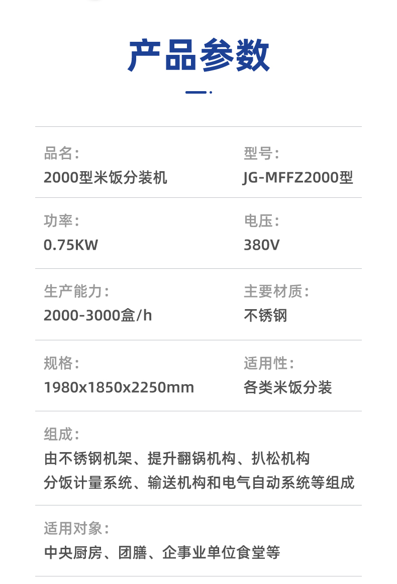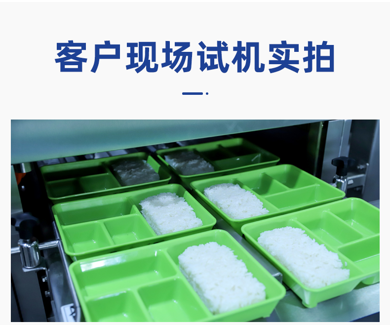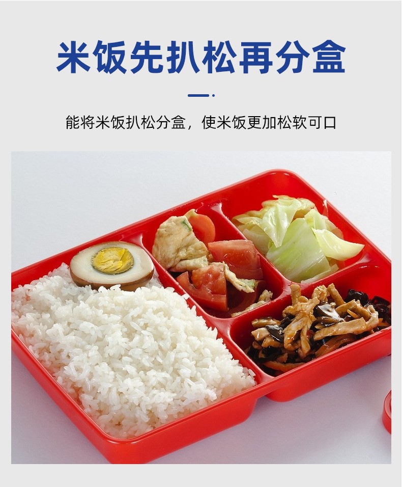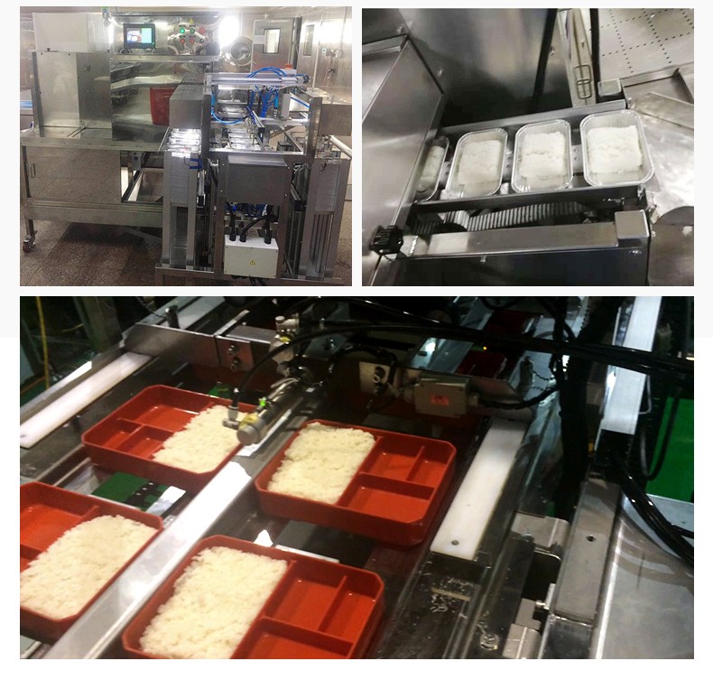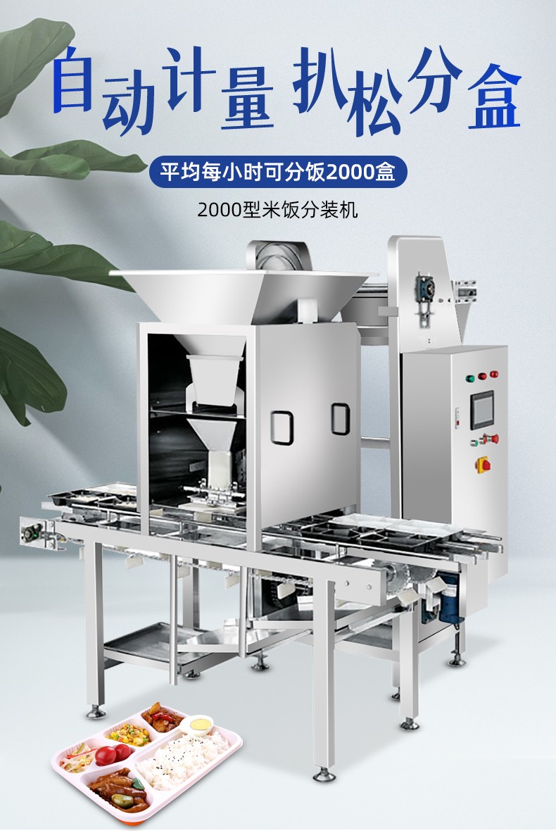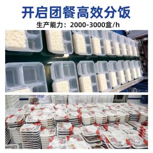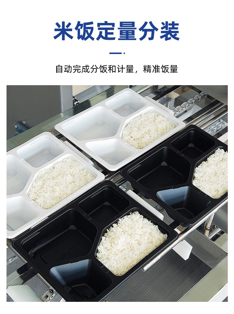 米飯分裝機,適用多場合大型米飯加工中心、快餐公司、大型配餐中心企事業(yè)單位、學校食堂、釀造企業(yè)。米飯定量分裝,自動完成分飯和計量,精準飯量。米飯先扒松再分盒,能將米飯扒松分盒,使米飯更加松軟可口。