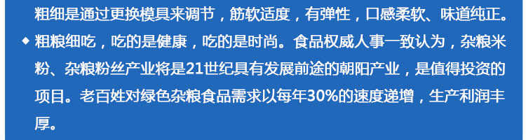 SZ-30不銹鋼米粉機(jī),可生產(chǎn)米粉、米線、桂林米粉、過(guò)橋米線、年糕、糍粑等產(chǎn)品。各種形狀都可生產(chǎn)(圓、扁),加工食品外表光滑,厚薄、寬窄、粗細(xì)均勻可調(diào),筋軟適度,有彈性,口感柔軟、味道純正。