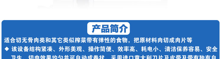 臺(tái)式全自動(dòng)切片機(jī),適合切無骨肉類和其他類似榨菜帶有彈性的食物,把原材料肉切成肉片,并可自動(dòng)成卷狀。可切牛肉片、羊肉片等