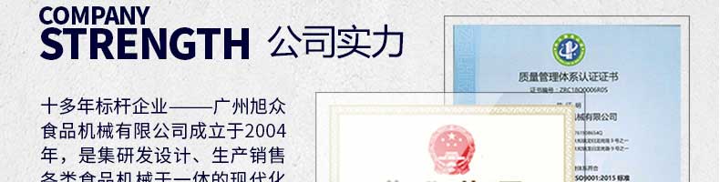 廣州旭眾食品機(jī)械有限公司是一家集科研開(kāi)發(fā),生產(chǎn)設(shè)計(jì),營(yíng)銷服務(wù)為一體的現(xiàn)代化生產(chǎn)企業(yè)?,F(xiàn)代化生產(chǎn)車間,精湛制造技術(shù),所產(chǎn)機(jī)械歷經(jīng)市場(chǎng)重重考驗(yàn),不斷贏得海內(nèi)外客戶的贊譽(yù)。