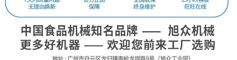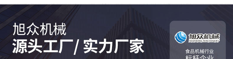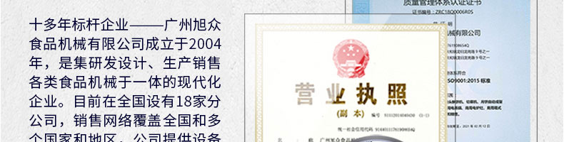廣州旭眾食品機械有限公司是一家集科研開發(fā),生產(chǎn)設計,營銷服務為一體的現(xiàn)代化生產(chǎn)企業(yè)?,F(xiàn)代化生產(chǎn)車間,精湛制造技術(shù),所產(chǎn)機械歷經(jīng)市場重重考驗,不斷贏得海內(nèi)外客戶的贊譽。