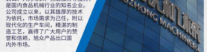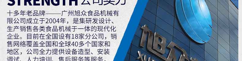 廣州旭眾食品機(jī)械有限公司是一家集科研開發(fā),生產(chǎn)設(shè)計,營銷服務(wù)為一體的現(xiàn)代化生產(chǎn)企業(yè)。現(xiàn)代化生產(chǎn)車間,精湛制造技術(shù),所產(chǎn)機(jī)械歷經(jīng)市場重重考驗,不斷贏得海內(nèi)外客戶的贊譽。