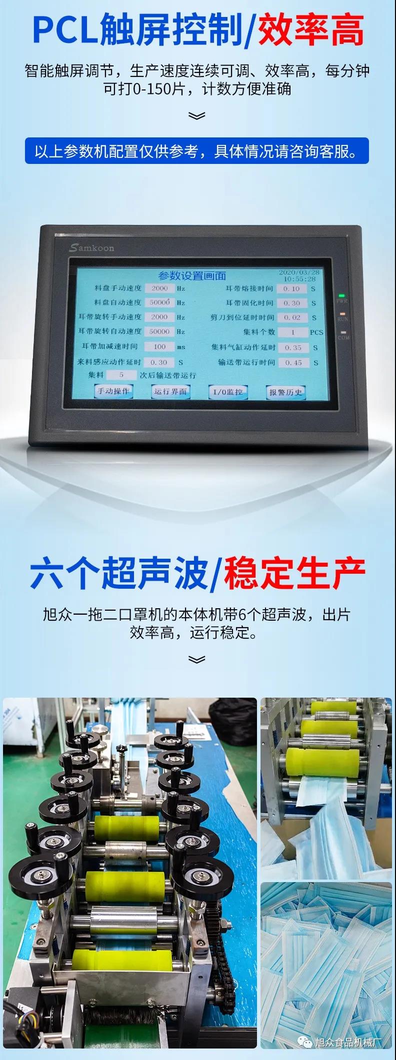 旭眾牌一拖二口罩機(jī)由一臺(tái)本體機(jī)帶動(dòng)兩臺(tái)耳帶機(jī)組成。本體機(jī)輸出ロ罩本體后,由輸送帶結(jié)構(gòu)將口罩本體片輸送到連接耳帶機(jī)的輸送帶上,再通過輸送帶將口罩片輸送到耳帶機(jī)的正面第一個(gè)口罩盤上方,最后通過氣缸下壓把口罩片放置到耳帶機(jī)的口罩盤內(nèi),后續(xù)由耳帶機(jī)完成口罩的耳帶熔接,包邊等動(dòng)作,從而完成一個(gè)耳帶口罩產(chǎn)品的生產(chǎn)。本機(jī)采用PLC、觸摸屏控制、主傳送帶采用單相馬達(dá)輸送、步進(jìn)馬達(dá)翻轉(zhuǎn),傳動(dòng)精確,控制穩(wěn)定,速度可調(diào)。