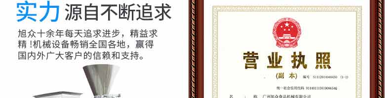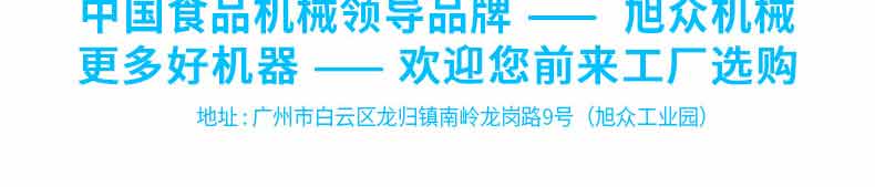 廣州旭眾食品機(jī)械有限公司是一家集科研開發(fā),生產(chǎn)設(shè)計(jì),營銷服務(wù)為一體的現(xiàn)代化生產(chǎn)企業(yè)?,F(xiàn)代化生產(chǎn)車間,精湛制造技術(shù),所產(chǎn)機(jī)械歷經(jīng)市場重重考驗(yàn),不斷贏得海內(nèi)外客戶的贊譽(yù)。