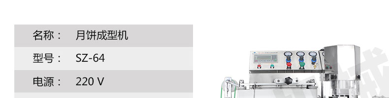 SZ-64月餅自動成型機(jī),可同于制作各種月餅,適合印制各種月餅。適用于蛋糕房、休閑食品廠、食品加工產(chǎn)、面包房、月餅加工廠、超市、學(xué)校、食堂等各種工作場所。可滿足不同客戶群體。免費提供工藝技術(shù)。