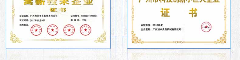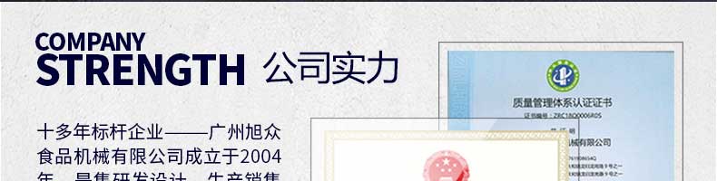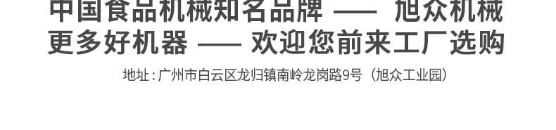 廣州旭眾食品機械有限公司是一家集科研開發(fā),生產(chǎn)設計,營銷服務為一體的現(xiàn)代化生產(chǎn)企業(yè)。現(xiàn)代化生產(chǎn)車間,精湛制造技術,所產(chǎn)機械歷經(jīng)市場重重考驗,不斷贏得海內(nèi)外客戶的贊譽。