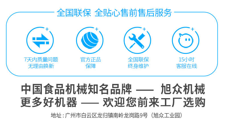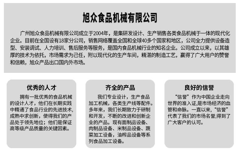 廣州旭眾食品機(jī)械有限公司是一家集科研開發(fā),生產(chǎn)設(shè)計(jì),營(yíng)銷服務(wù)為一體的現(xiàn)代化生產(chǎn)企業(yè)?,F(xiàn)代化生產(chǎn)車間,精湛制造技術(shù),所產(chǎn)機(jī)械歷經(jīng)市場(chǎng)重重考驗(yàn),不斷贏得海內(nèi)外客戶的贊譽(yù)。