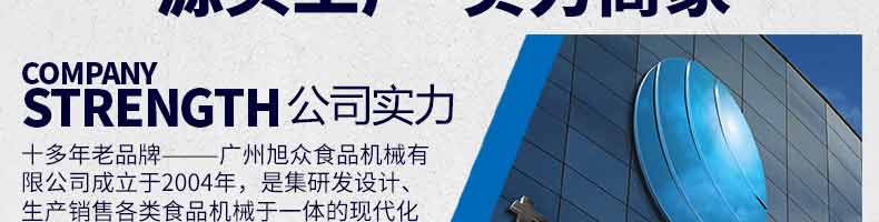 廣州旭眾食品機(jī)械有限公司是一家集科研開發(fā),生產(chǎn)設(shè)計(jì),營(yíng)銷服務(wù)為一體的現(xiàn)代化生產(chǎn)企業(yè)。現(xiàn)代化生產(chǎn)車間,精湛制造技術(shù),所產(chǎn)機(jī)械歷經(jīng)市場(chǎng)重重考驗(yàn),不斷贏得海內(nèi)外客戶的贊譽(yù)。